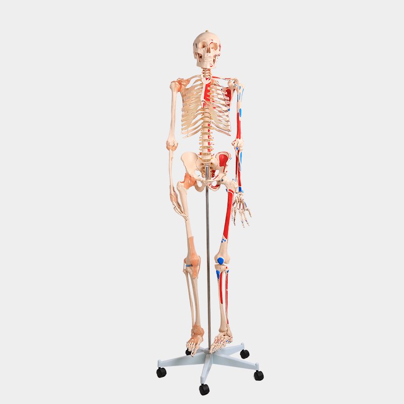 簡介:這款經(jīng)濟型的、真人大小的、關節(jié)相連的塑料模型是基礎解剖教學的理想模型,手臂和腿部可拆下供研究。顯示神經(jīng)分支、脊椎動脈和腰椎間盤等。頭顱含可活動的下巴、可移動的頭顱蓋、骨縫線和三顆可取下的下牙。用PVC制成,左邊附韌帶右邊帶肌肉著色,可水洗,不破碎。